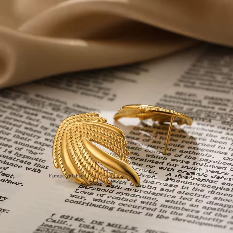 - *Earring Details*: The earrings are gold with a textured, curved design resembling leaves or feathers.