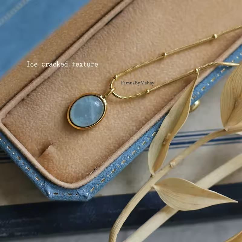 • *Pendant Details*: The pendant features a light blue stone with an "Ice cracked texture" and is encased in a gold rim.