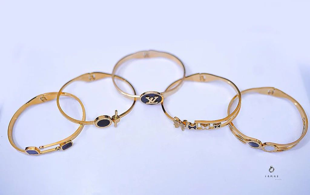 Add a touch of luxury and sophistication to your accessory collection with this stunning pack of 5 gold-tone bangles. Each piece features a unique and stylish design including iconic fashion-inspired motifs such as the LV logo, double clock , single clock and double square and butterfly elements. These bangles are crafted to complement both casual and formal outfits, making them a versatile addition to your jewelry box. Made with a durable finish, they offer a sleek shine and lasting elegance.